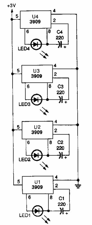 We found this circuit in a Popular Electronics from the 80s. The circuit is based on the LM3909, a low voltage component for driving LEDs.