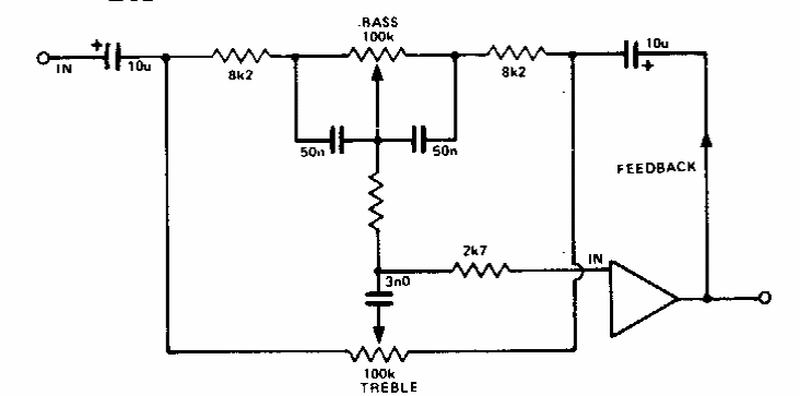 In the figure we have the typical circuit of a Baxandall tone control applied to an operational amplifier. The operational can be of any type.