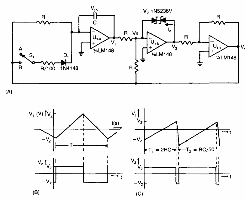 This circuit is based on documentation from the 1980s. It can be designed with modern operational equivalents. The source is symmetrical and next to the diagram are the waveforms of the generated signals.