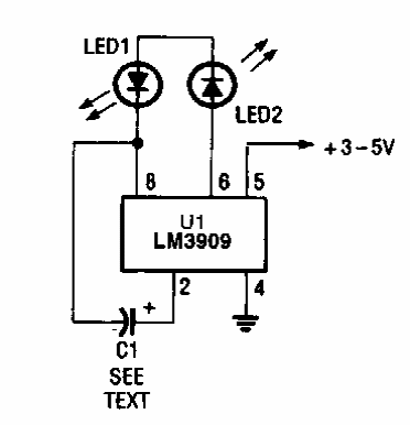 This circuit was found in a Popular Electronics from the 80's. The circuit can be powered with voltages from 3 to 5 V and causes two LEDs to flash alternately at a frequency determined by C1.