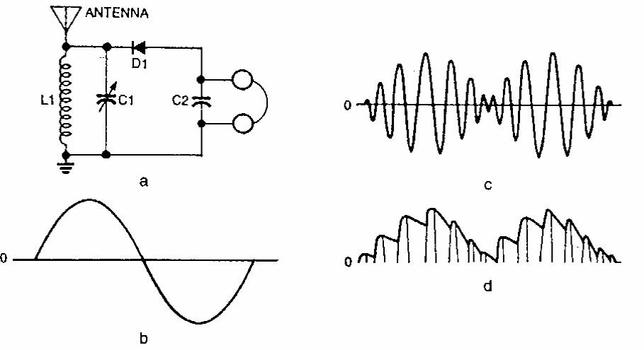 This crystal or galena radio uses a germanium diode. C1 is an old radio variable and L1 has 100 turns of 26 or 28 wire in a 1 inch PVC pipe. The antenna must be a long wire.
