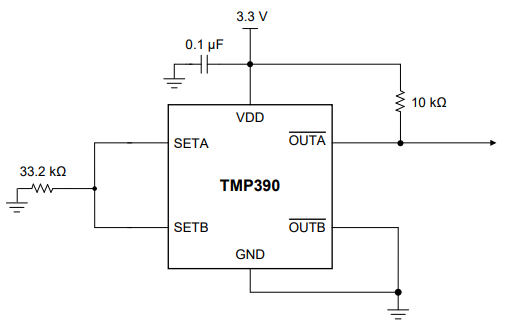 This is a one-channel application for the Texas Instruments TMP390 sensor obtained directly from its datasheet (2019). The circuit is powered by 3.3 V, interfacing directly with microcontrollers and in this case firing when the temperature reaches 78º. The hysteresis is 5º C. More information can be obtained in the datasheet.