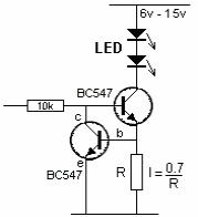 With this circuit it is possible to keep the current in an LED constant even if the supply voltage varies between 6 and 15 V. The possible applications are in the mechatronics area. The circuit is from an American documentation and the values of resistors for several currents are in the table below.