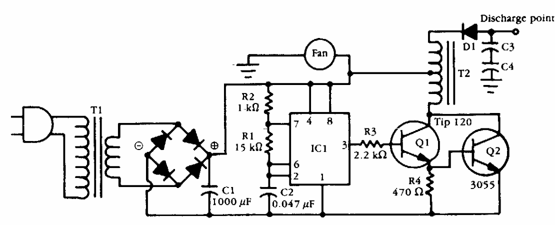 This circuit was obtained from American documentation from the 1990s. The transformer can be a car ignition coil that works like an autotransformer. Q2 must be equipped with a heat sink.