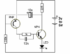 The difference of this circuit in relation to the previous circuit is in the position of the transistors and the LED that is excited by the NPN and not by the PNP as in the previous version. The 10 uF capacitor determines the frequency of blinking and can be changed.