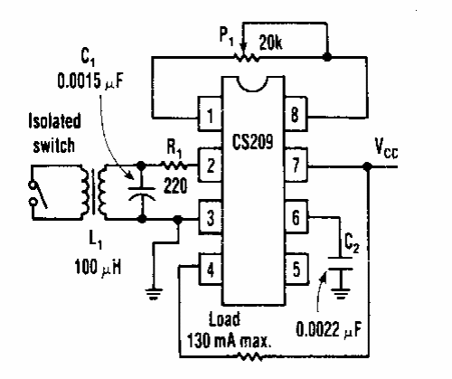 This fully isolated control circuit provides an output signal by triggering a 130 mA relay when the switch is closed. The circuit is supplied with voltage from 9 to 12 V depending on the relay.