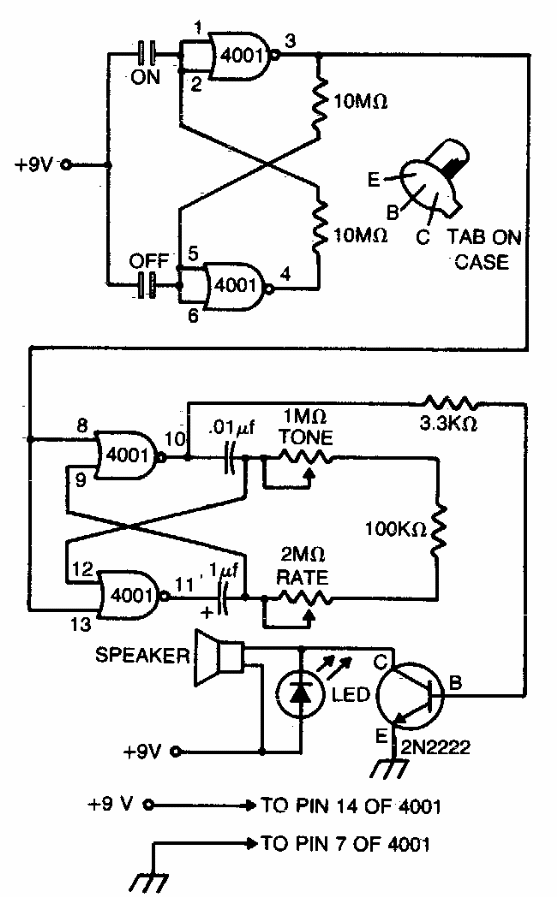 This simple CMOS metronome circuit can be mounted in a small box, providing both sound and light sources.