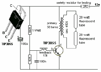 We found this circuit recent English documentation. The circuit uses a common transformer and can power a 40 W lamp or two 20 W lamps from the car battery.