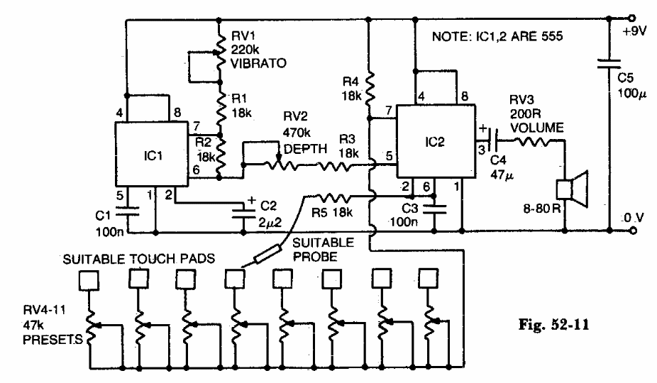 This organ, played by a probe was found in no old documentation, but it can be easily implemented these days. The integrated circuits are 555. The trimpot allows individual tuning of the keys.
