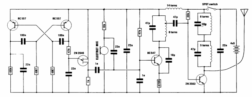 This transmitter influences an oscillator that modulates the transmitting stage and at the same time detects sound signals with a small microphone. We found the circuit in an American documentation. The capacitors must be of the ceramic type. See the previous circuits for details of the coils.
