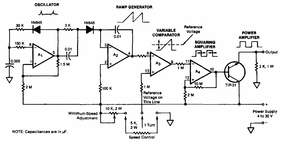 We found this circuit in a NASA documentation from the 1980s. The circuit is based on operational amplifiers such as the LM3900 and can be powered by a simple source of 4 to 30 V. The repetition rate of the pulses is 1 kHz.