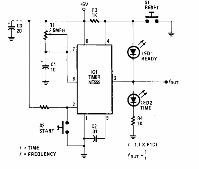 This circuit was obtained in a Hands-On Electronics from the 90's. The circuit turns on one LED at the end of the timer, erasing the other. The timing can be increased by changing C1.