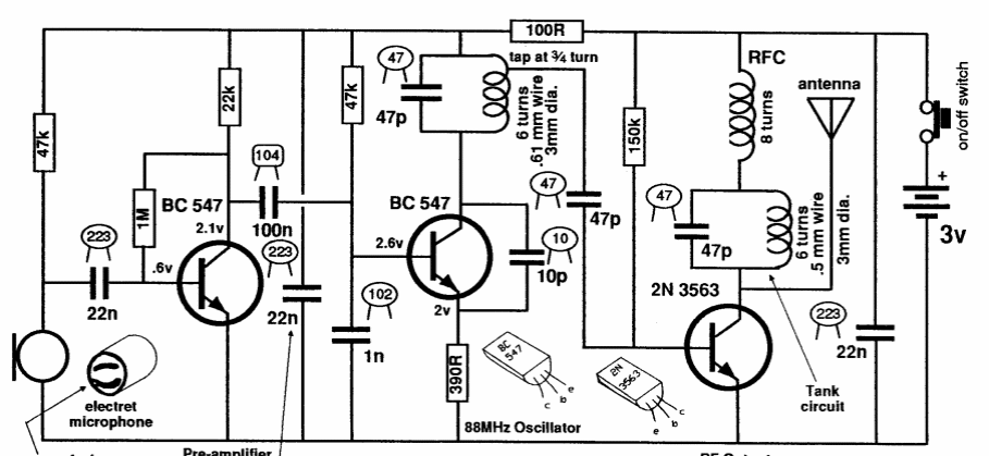 This small transmitter has an RF amplifier stage with coupling made from the central socket of the oscillating coil. The range depends on the antenna and the receiver. The circuit was found in American documentation.