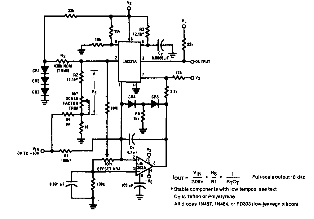 This circuit is from a National Semiconductor manual from the 1980s. The integrated circuit is rare today and next to the diagram we have the formula for calculating the components.