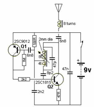 We found this circuit in recent English documentation. The frequency is adjusted by the core of the oscillating coil. Modern equivalent transistors can be used, as the original circuit appears to have come from Japanese documentation for the transistors it uses.