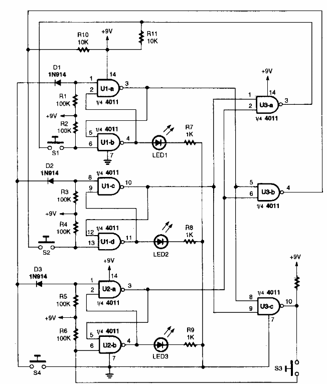 This game for 4 competitors was found in a Popular Electronics from the 80's. The circuit has CMOS technology and can be powered by voltages from 6 to 12 V.