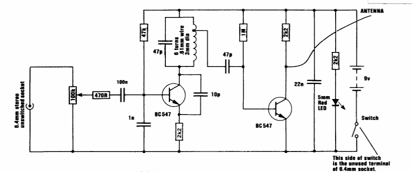 The purpose of this circuit is to transmit the signal from a guitar pickup to an FM receiver placed nearby. The circuit is powered by batteries and the antenna consists of a 15 to 40 cm long piece of wire. The transistors can also be the BF494.