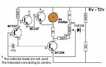 We found this circuit in recent documentation from England. The circuit is for motors up to 100 mA, but its capacity can be increased by replacing the BC338 with a BD135 equipped with a heat radiator.