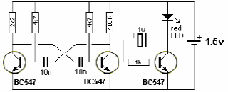 In the figure we have the way to activate a red LED that needs 1.7 V or even others with higher voltage with a 1.5 V supply. The circuit has a doubling action and must be tested according to the LED.