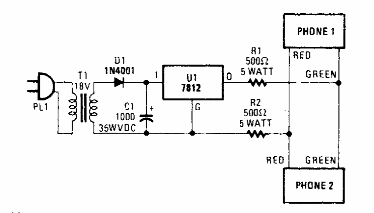 With this circuit it is possible to use a pair of old telephones in a wired communication system. The circuit is from a Popular Electronics from the 90s.