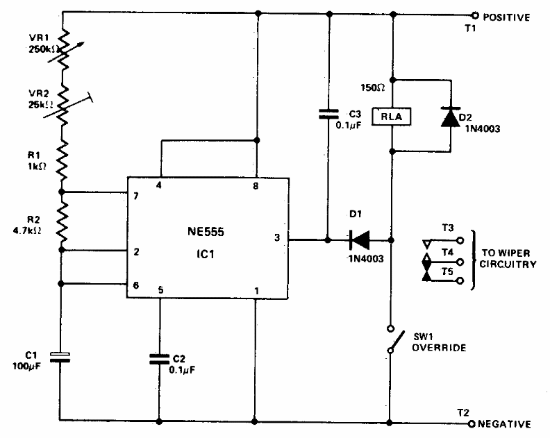 This simple windscreen wiper interval was found in old American documentation. The relay must have contacts of at least 2 A.