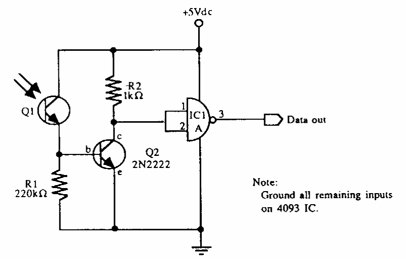 This is the receiver for the previous transmitter. The signal consists of digital pulses with a compatible TTL or CMOS output. The integrated circuit is a 4093 and a photodiode of any type.