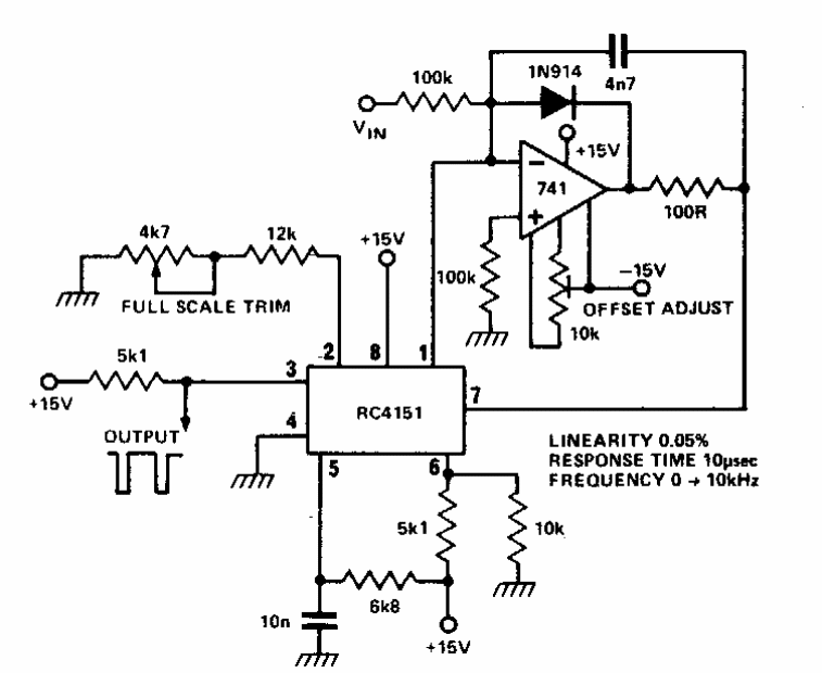 This circuit makes use of components from the time it was published. The TCA151 is not a common component today. The circuit generates 10 to 10 kHz signals.