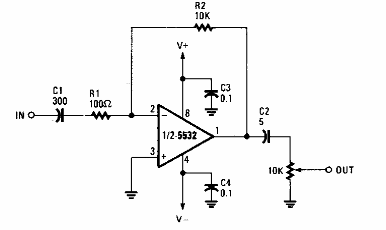 In the figure we have the basic configuration of an operational amplifier for audio signals. The circuit is from a Radio Electronics from the 90s. The power supply must be symmetrical.