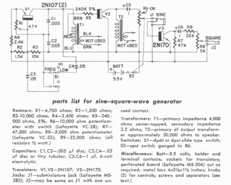 This circuit was found in a publication by Gernsback from 1960. The circuit generates signals from 420 to 1200 Hz using germanium transistors of the time.
