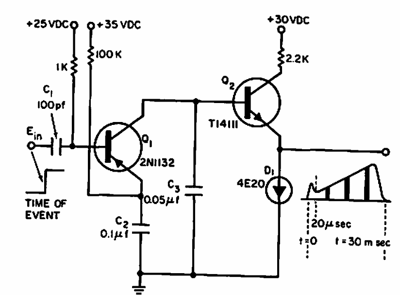 Found in a 1965 Electronic Design, this circuit produces a signal with the waveform shown in the figure from an input pulse. Components admit equivalents.
