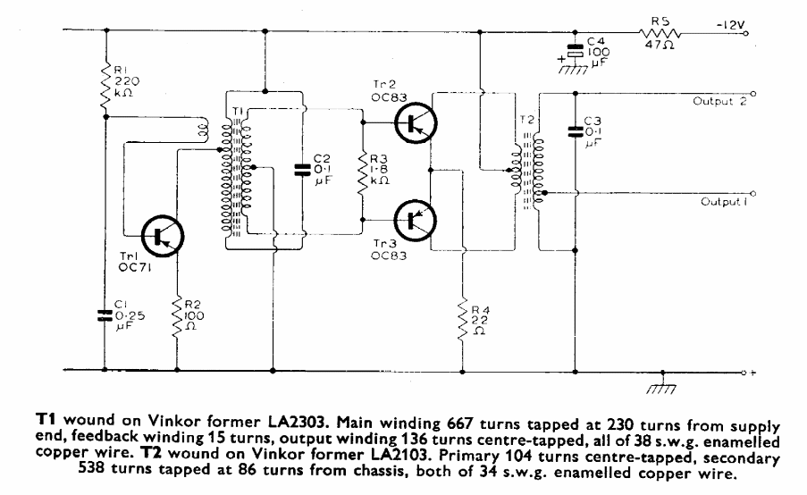 This circuit was taken from the 1960's Mullard Transistor Manual. Information about the coils is given along with the diagram.