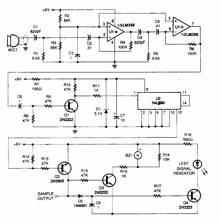 This circuit was found in a Popular Electronics from the 90s. The circuit uses an ultrasonic microphone. The indicator is dual with LED and Buzzer.