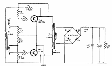 Found in a 1960's Mullard transistor manual, this circuit has an input current of 4.4 A and an output of 193 V operating at 514 Hz. No information about the transformer is given.