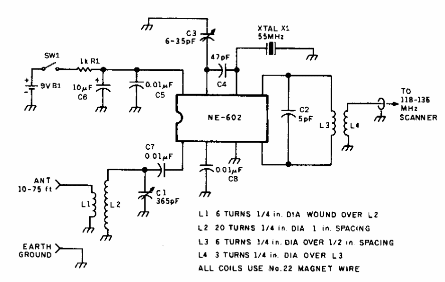 This circuit converts signals from the shortwave band to the 118 to 130 MHz VHF band used in aviation. The circuit uses a 55 MHz crystal. We found it in documentation from the 90s.