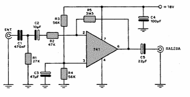 This is another one of the many preamp configurations with operationals that can be found on this site. The gain is 50 dB and can be changed by changing the 3M3 resistor.