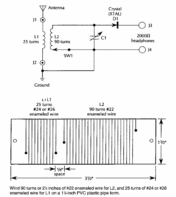 This crystal or galena radio was found in documentation from the 1990s. The earpiece must be a high impedance crystal or magnetic earpiece and D1 can be any germanium diode.