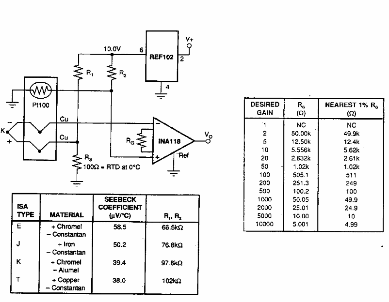 Found in old American documentation, this circuit uses Burr Brown components. The table opposite provides the components to be used for various gains.