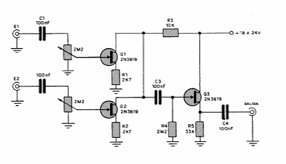 This configuration with JFET transistors is well known and can be found with variations elsewhere on this site. FETs support general-purpose equivalents.