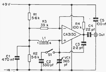 Using a CA3130, this circuit generates signals from approximately 550 kHz to 1.6 MHz using a common AM radio coil. The circuit is from a 1977 documentation.