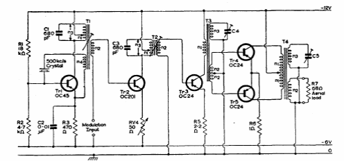 We found this 4W transmitter in a Mullard transistor manual from 1960. The circuit is powered by 12V, and no information is given about winding the coils.