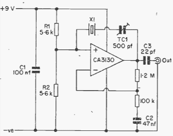 This oscillator with the CA3130 was obtained from an English publication from 1977. The circuit does not need a symmetric power source and crystals of lower frequencies can be used.