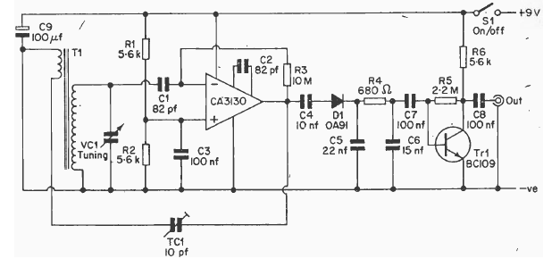 This circuit is from an English publication from 1944. The power supply need not be symmetrical. The output is in high impedance headphones or can be applied to an amplifier. No information was given about the coil.
