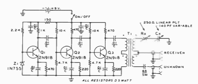 This circuit combines several white noise generators for testing transmission equipment. The circuit is from a 1977 documentation.