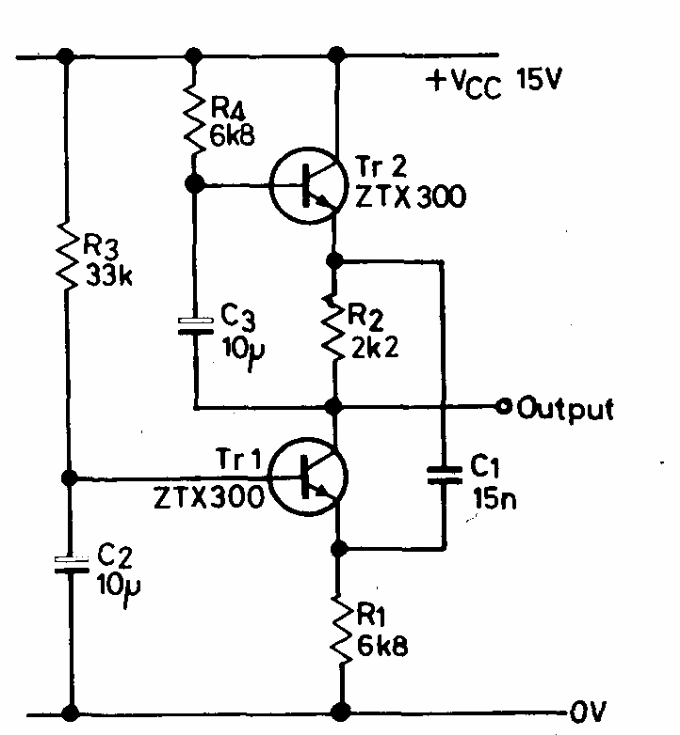 The circuit is from Ferranti's 1974 transistor manual. Transistors are general purpose types, and the output waveform is rectangular. Components can be changed to other frequencies.