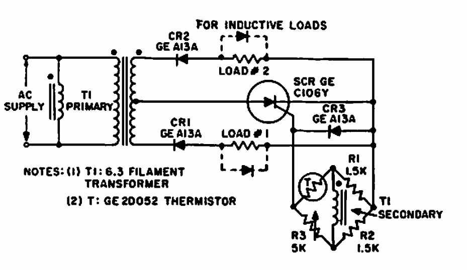 This circuit was obtained from a 1967 GE SCR manual. It is intended for controlling relays responding to a decrease or increase in temperature.