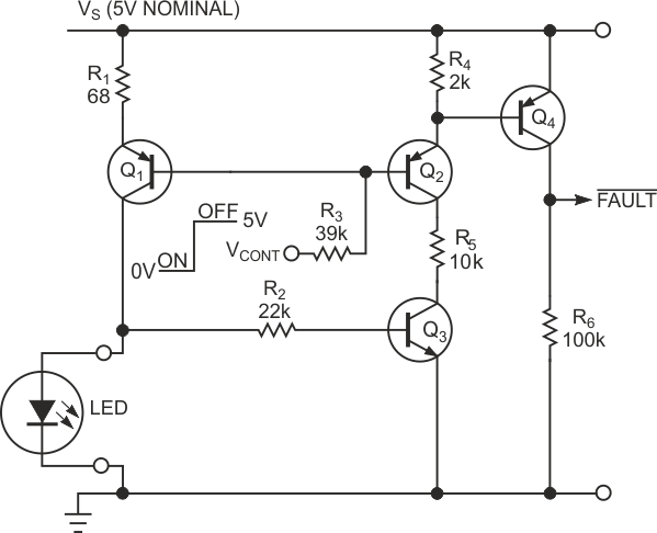 This circuit uses common transistors for a fault indicator that turns on an LED and provides an output signal to an external circuit. The circuit is from a 2021 documentation.