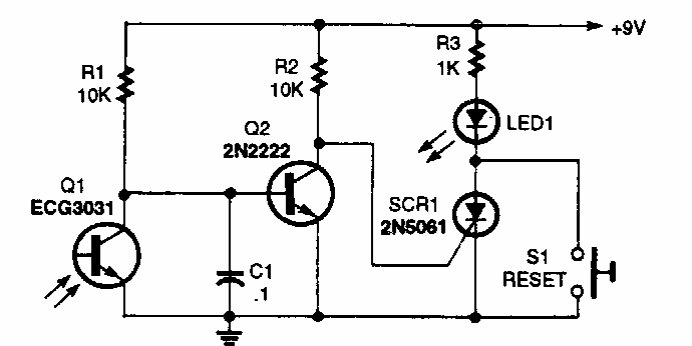 Found in Popular Electronics this circuit triggers an SCR and lights an LED when the location of the sensor is dark.