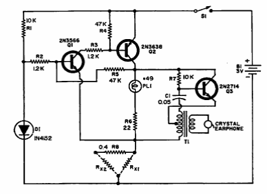Found in a 1967 Electronics World, this circuit uses components from the time. Modern general-purpose transistors can be used. The transformer is output from transistor radios.