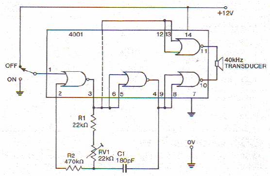 Using a 4001 and a high impedance transducer this circuit generates 40 kHz sound signals set to RV1. The supply can be made with voltages from 6 to 12 V.