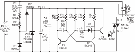 We found this circuit in an American documentation. The power of the load, in this case, incandescent lamps, will determine the current of the triac used. The frequency depends on C4 and C5.